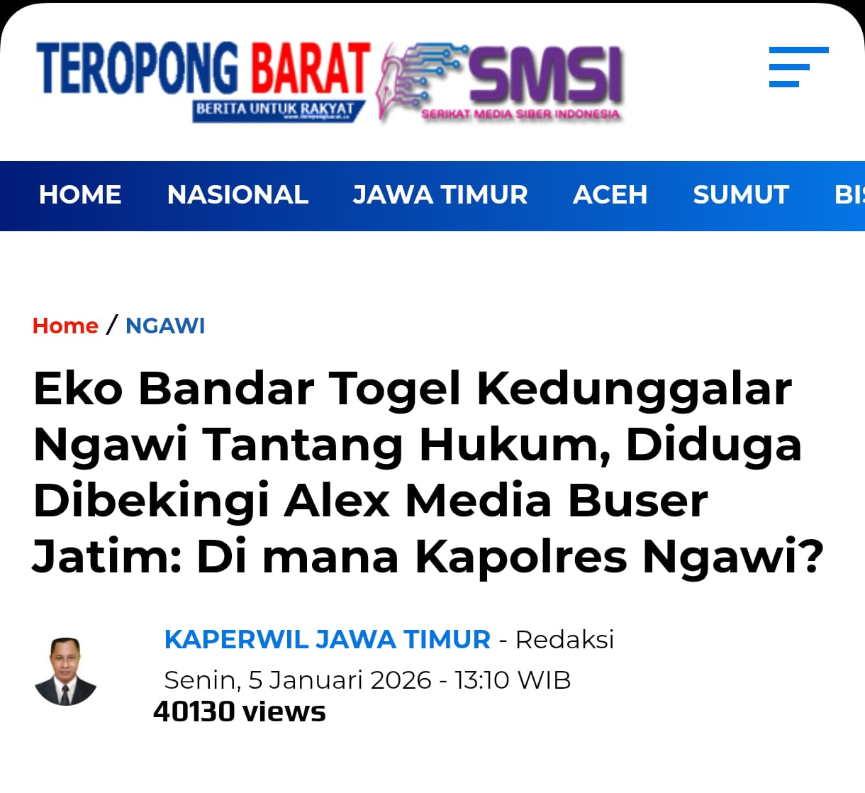 NGAWI, BUSERJATIM.COM GROUP – Alex, yang dikenal sebagai Media Buser Jatim, secara resmi menyampaikan hak jawab sekaligus somasi terbuka kepada media online teropongbarat.com atas pemberitaan pada tanggal 5 Januari 2026 berjudul “Eko Bandar Togel Kedunggalar Ngawi Tantang Hukum, Diduga Dibekingi Alex Media Buser Jatim: Di Mana Kapolres Ngawi?”.13/1