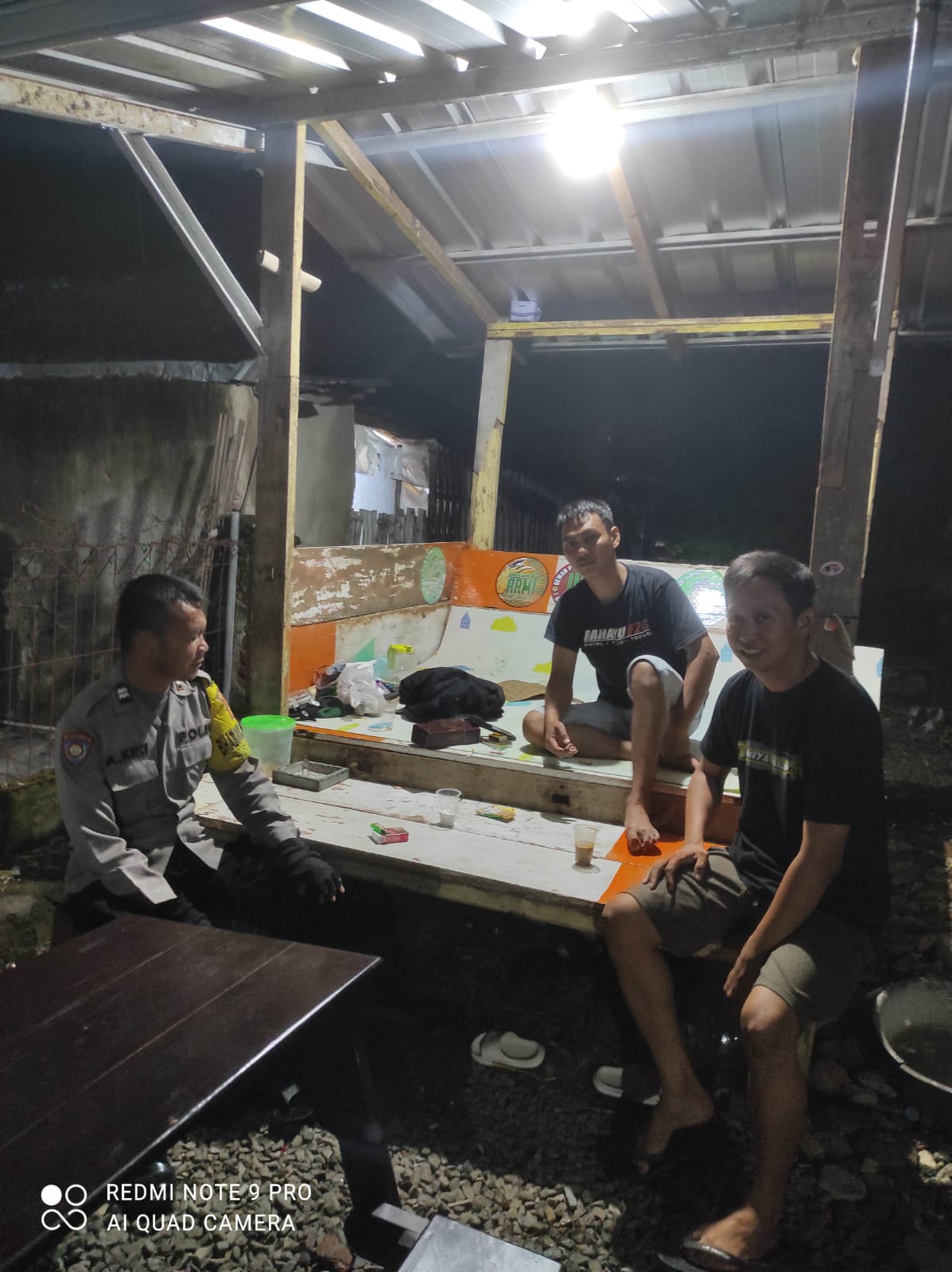 Dalam suasana malam yang tenang, petugas patroli Polsek Sindang menyisir pemukiman warga dan menyempatkan diri singgah di pos-pos kamling.